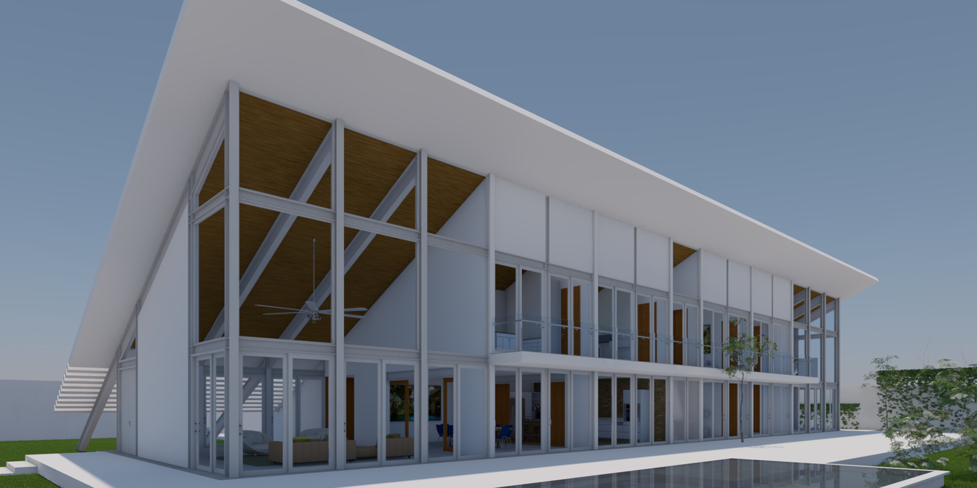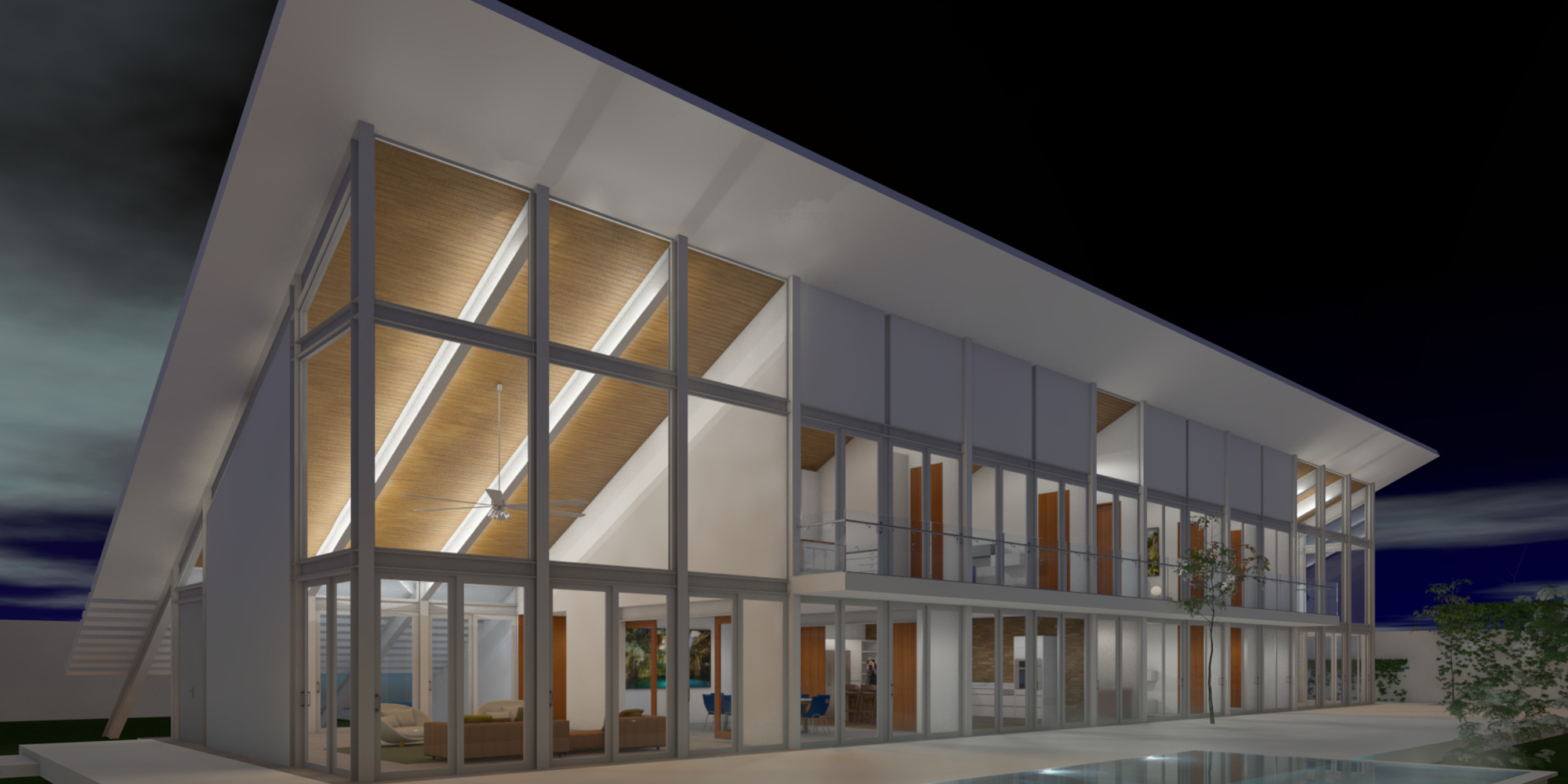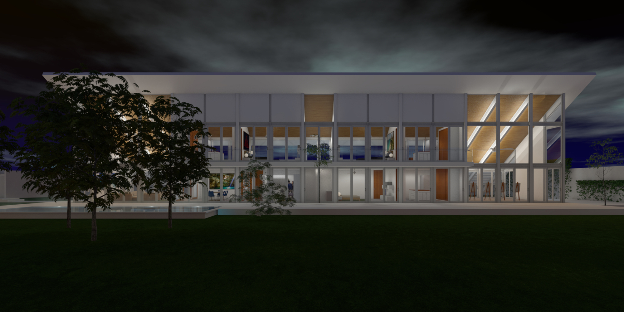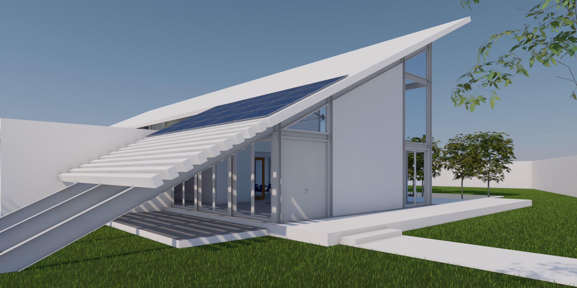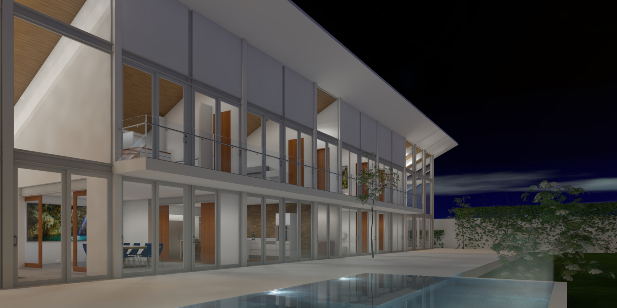 Esta losa logra dar sombra a la fachada norte, que está construida enteramente de vidrio dos dobles alturas,(sala de estar y taller de pintura) flanquean las dos plantas de la casa donde se ubican: comedor, cocina y recámaras