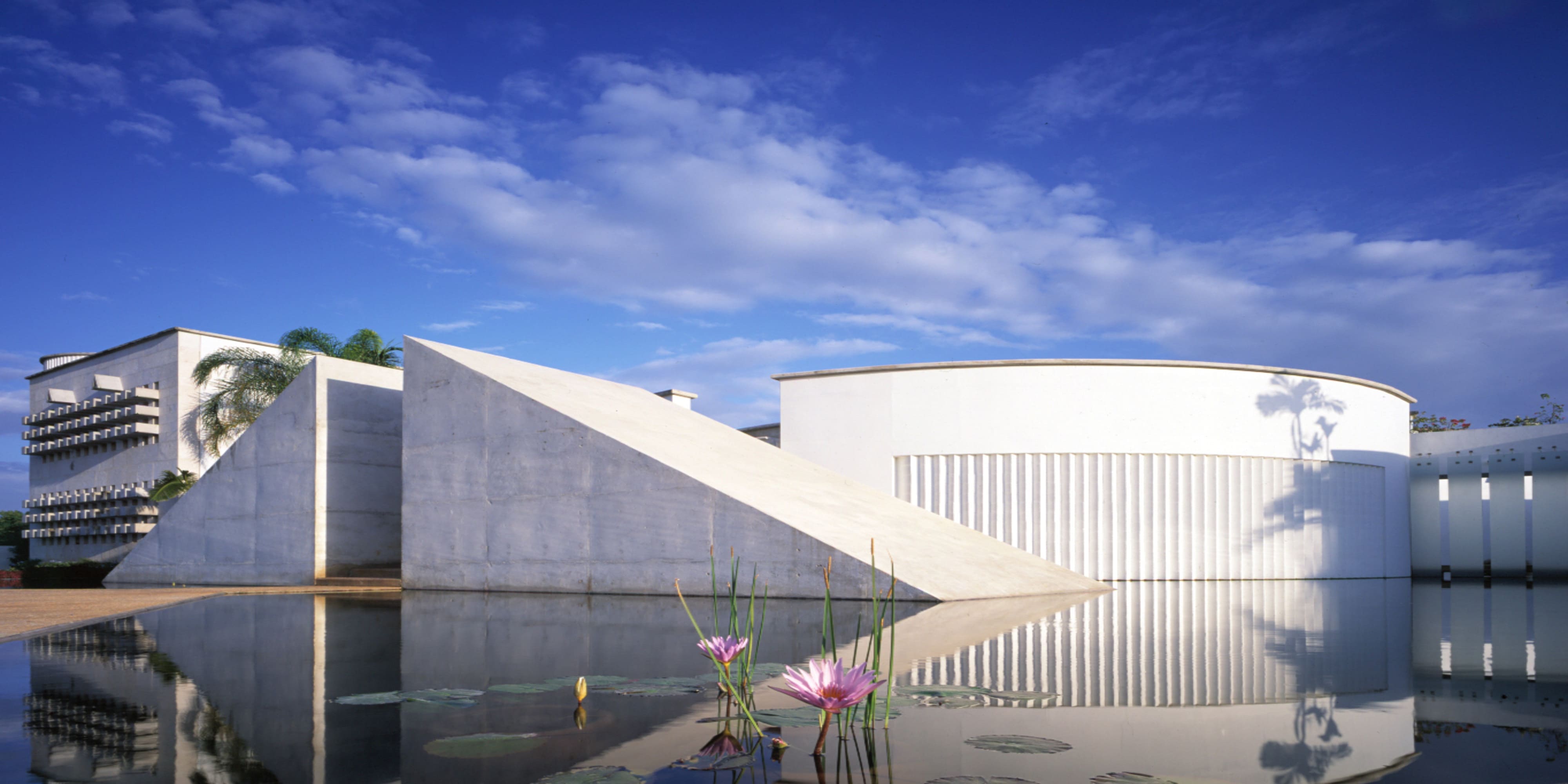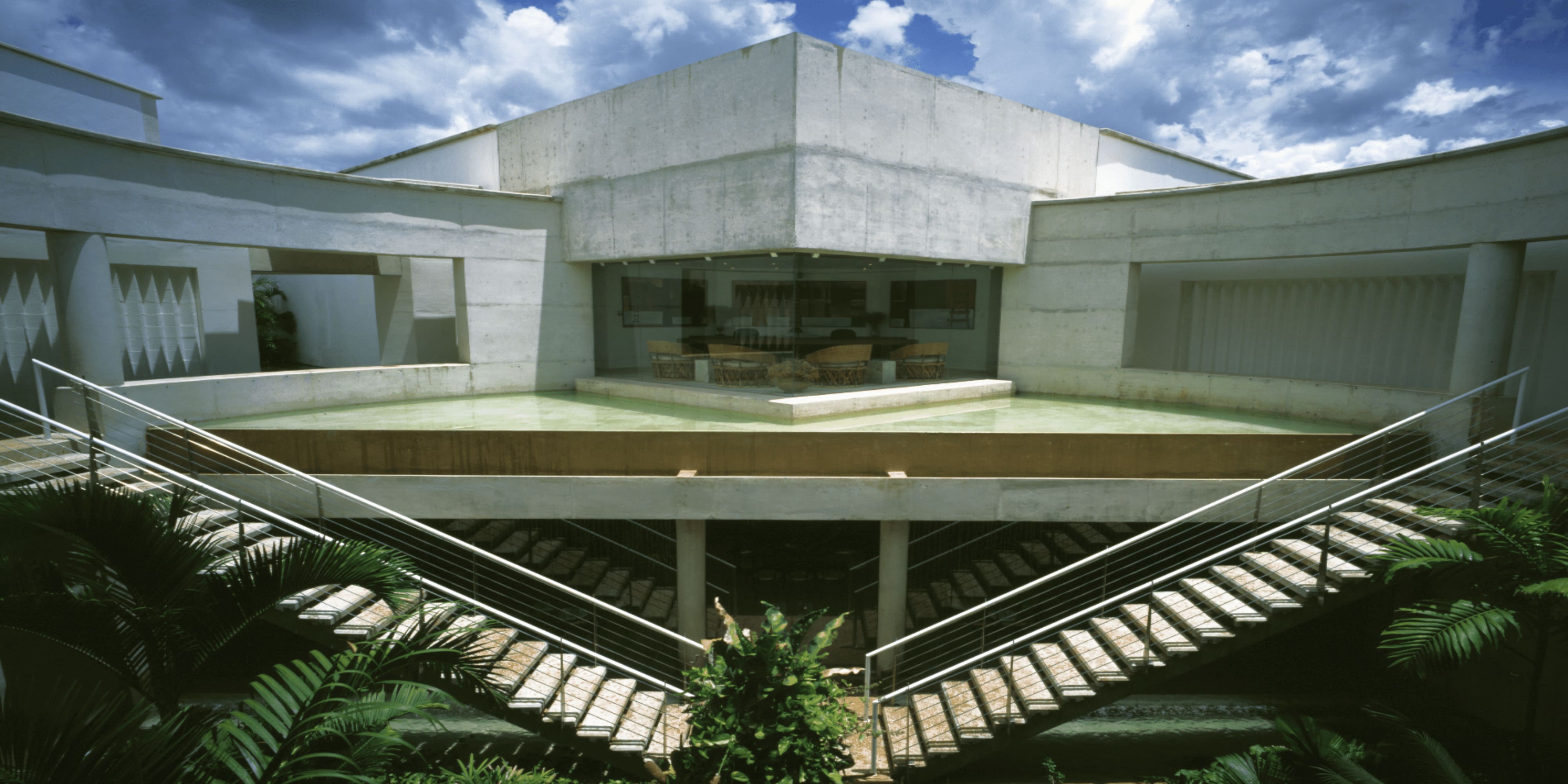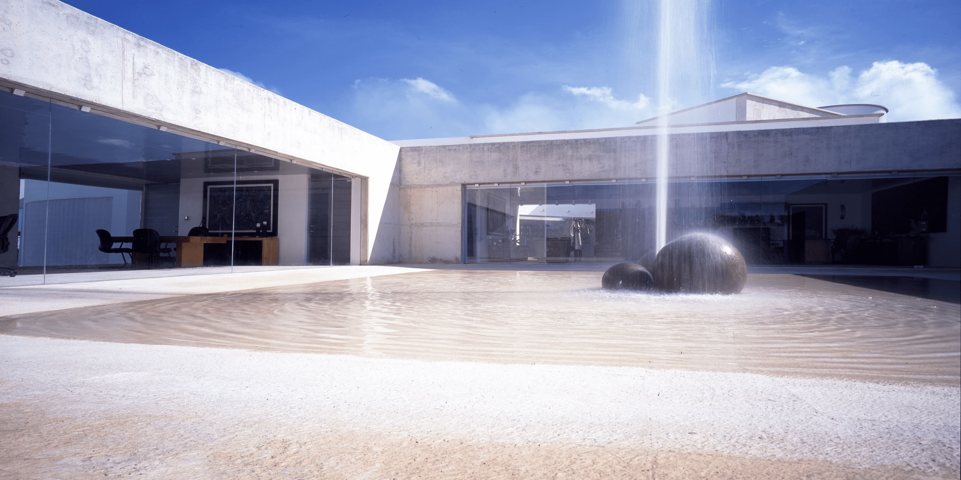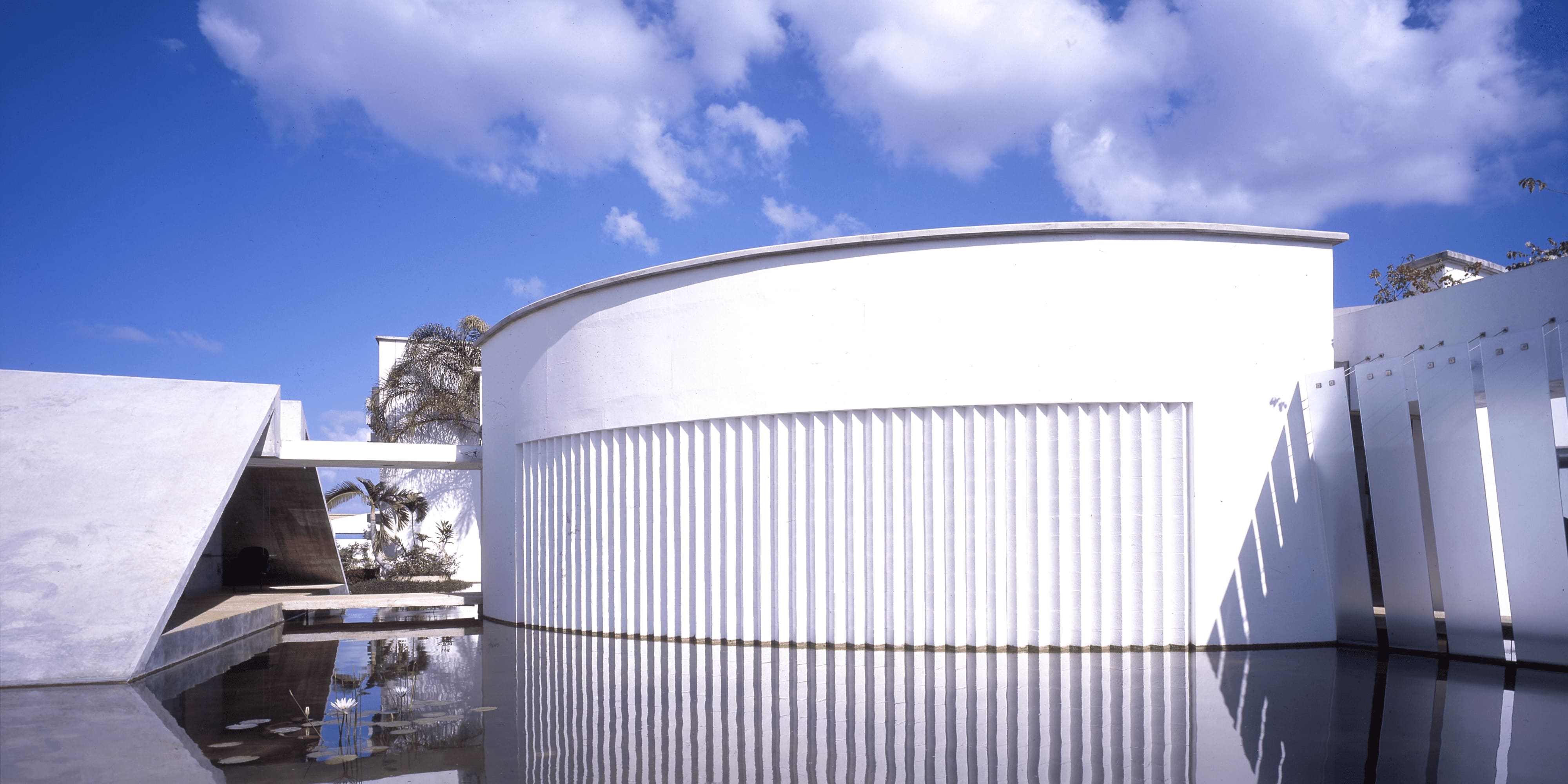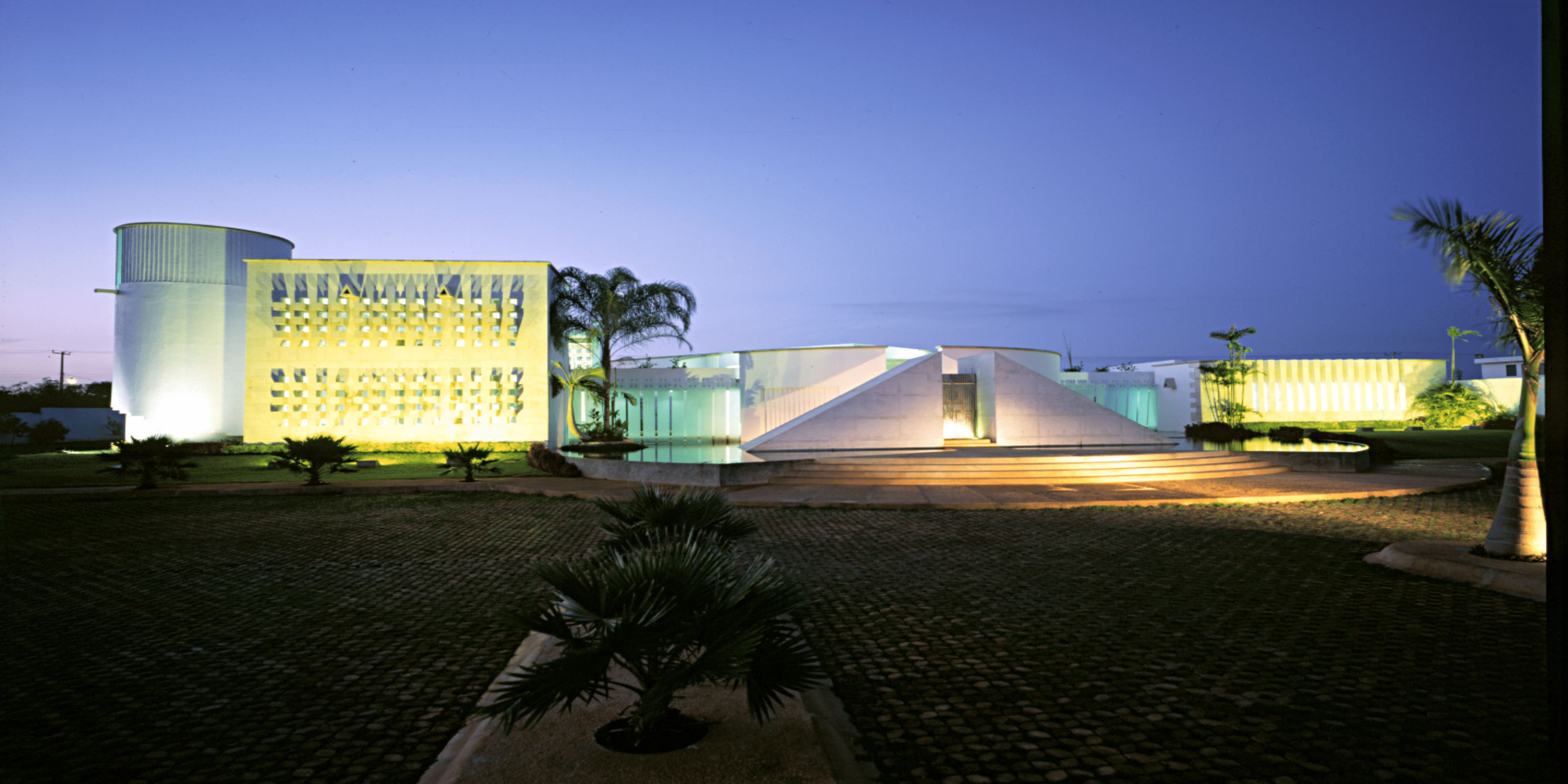 I conceived this work as a set of edificios around patios that in turn form a whole immersed in a large pond. The door is formed by two triangular prisms that evoke the Mayan architecture "Puuc style" found in Uxmal, Kabáh, Labná, etc. all these in Yucatán, Mx.