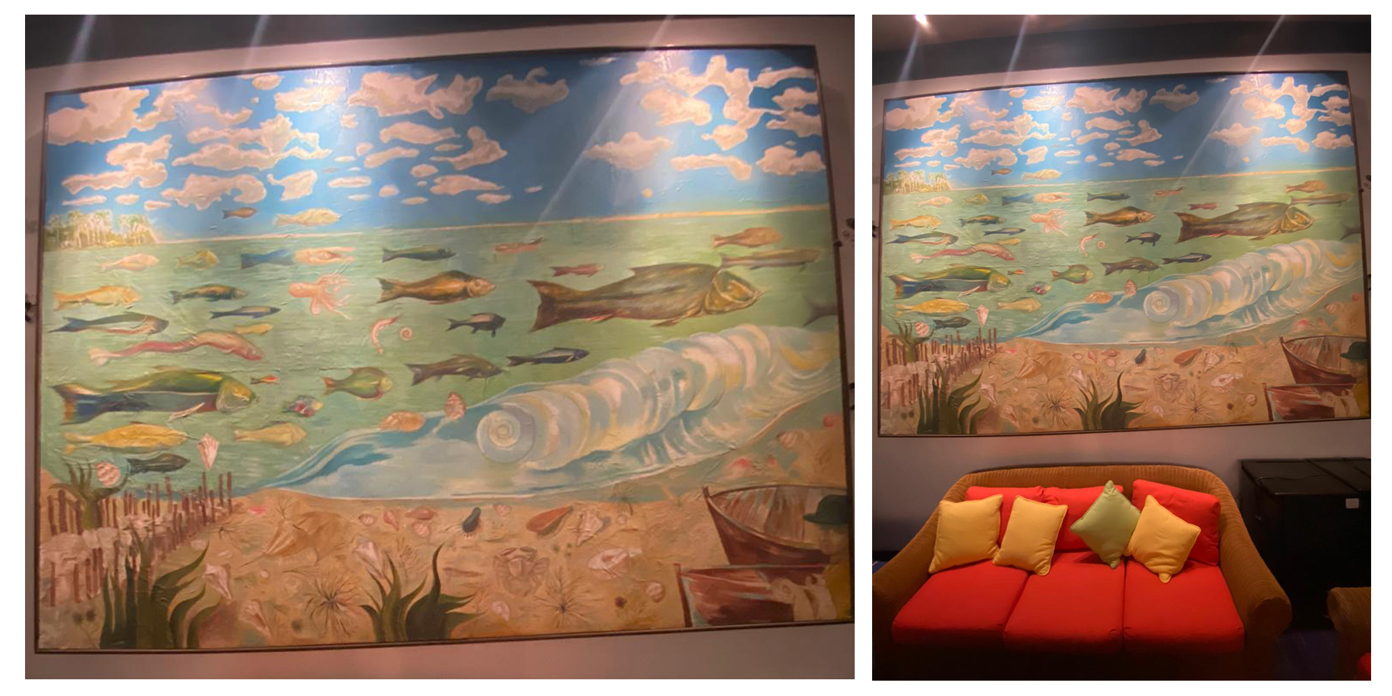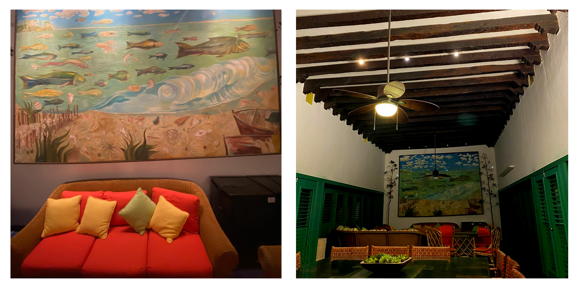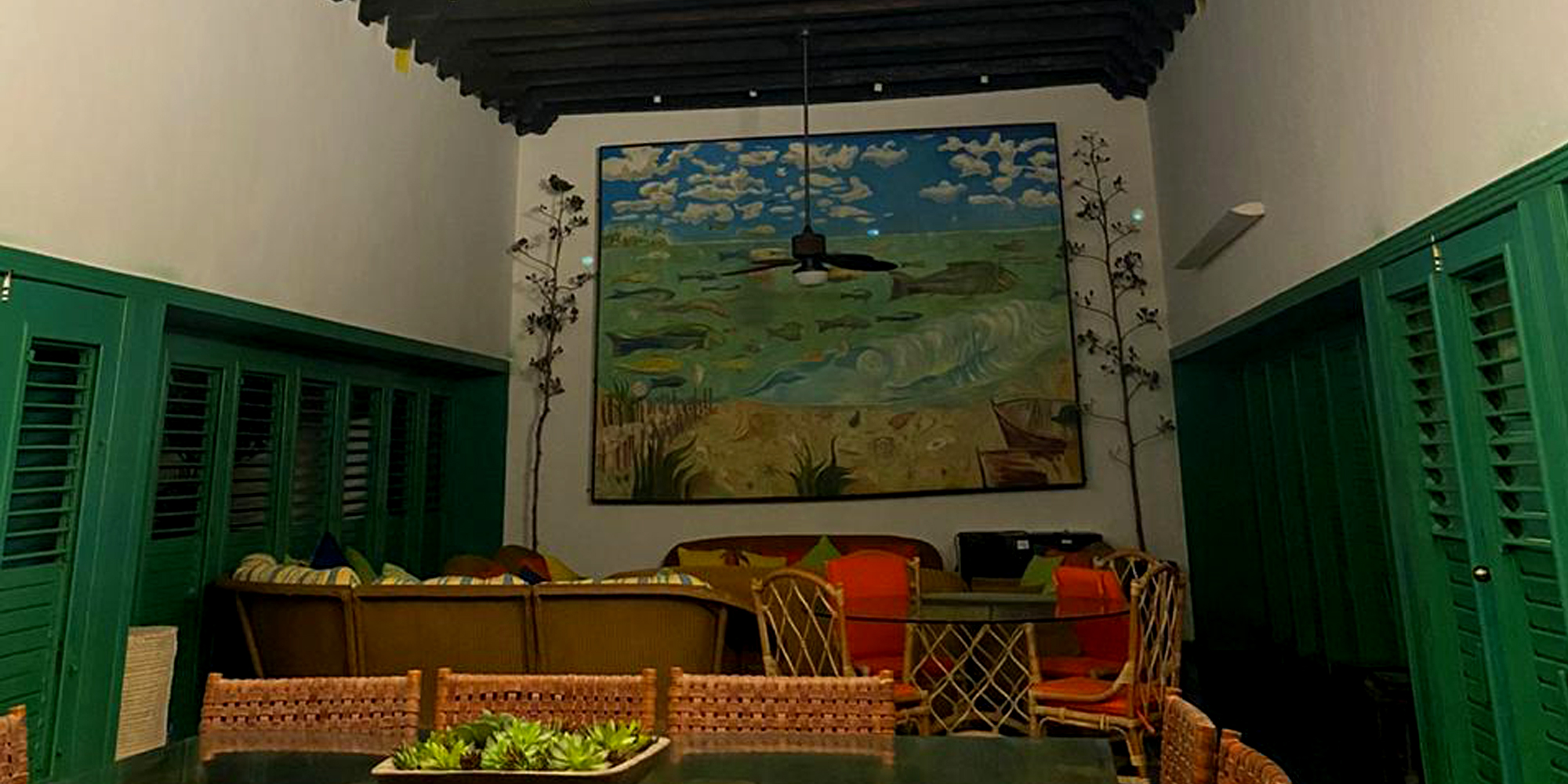 El ambiente interior y exterior se “funden” en uno solo y así lograr estar en una casa de playa en Yucatán. Se usa el color para expresar nuestra cultura. Tanto el mobiliario como el arte, refuerzan el ambiente informal y práctico con que se vive frente al mar y se recurren a temas como las pitahayas fruta yucateca que se da especialmente en verano, cayucos pescadores, fauna marina el tema del gran cuadro central.