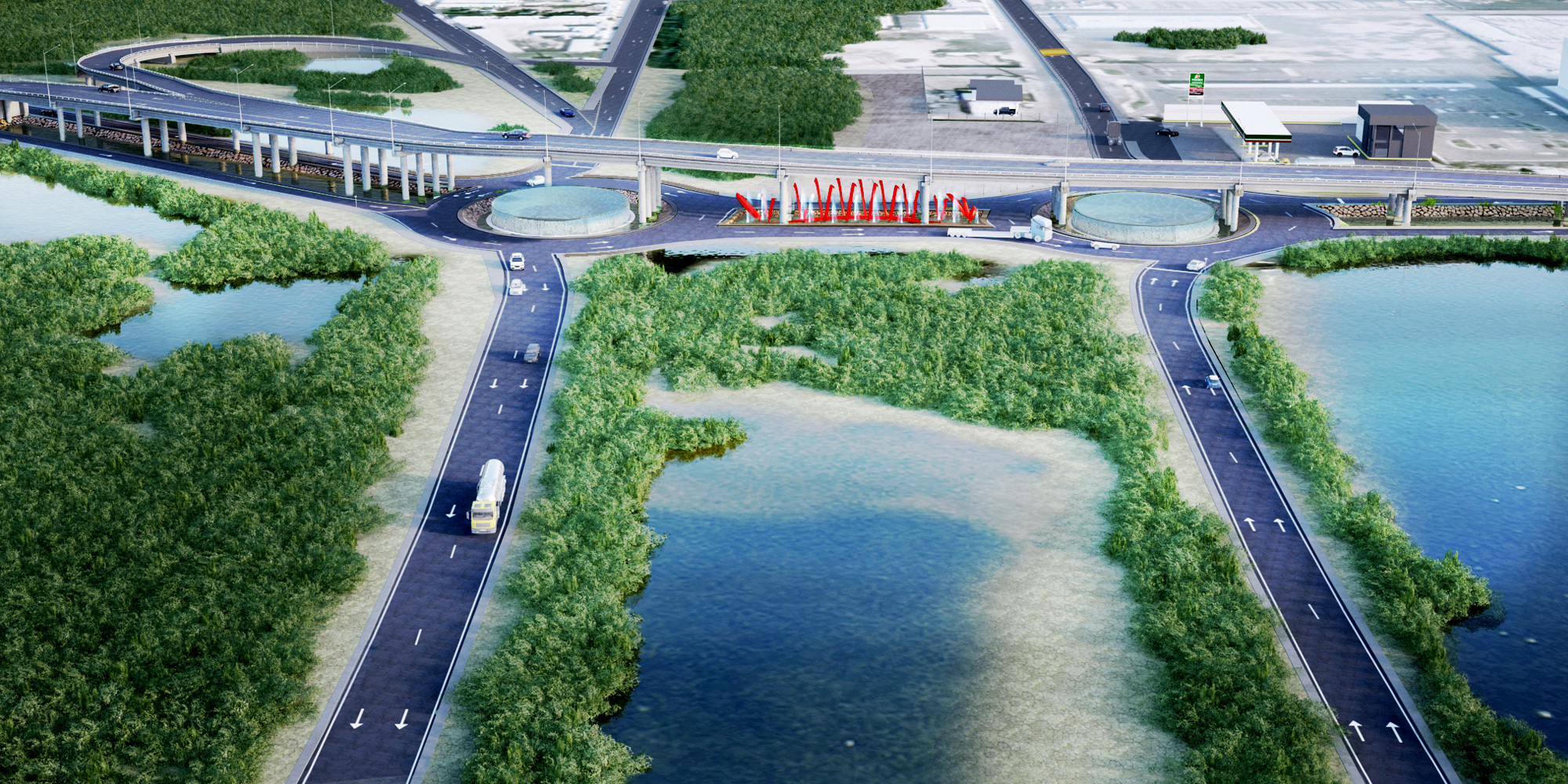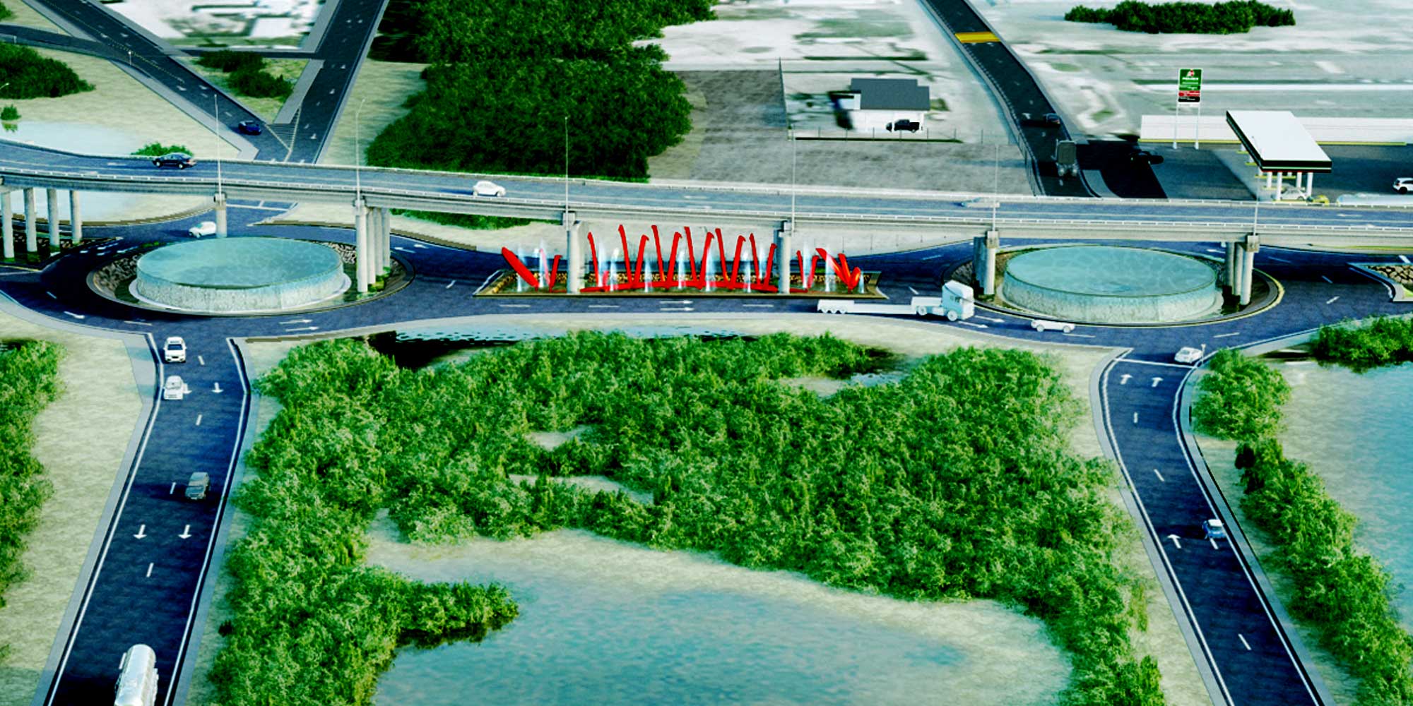 Escultura de acero y fuentes de agua que en su conjunto expresa a un pescado; es la puerta de entrada al bello puerto de Progreso Arquitectos: Alejandro Medina.